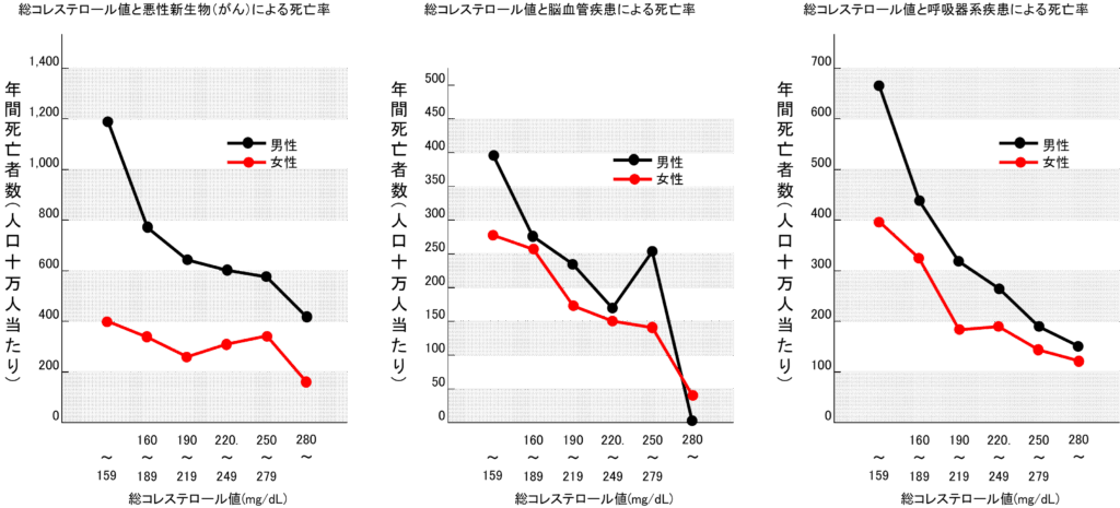 ところが、コレステロールは先ほども書きましたように体になくてはならないものです。そのため、コレステロールが低いと、細胞膜が弱くなり、がん、脳血管疾患(脳出血など)、呼吸器系疾患(肺炎など)が増えてしまうのです。
